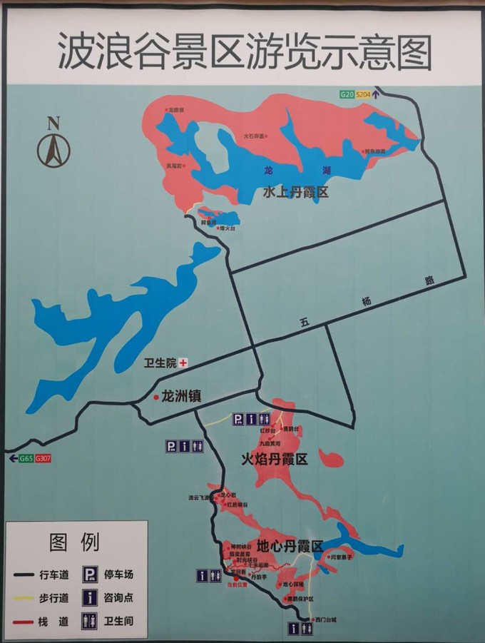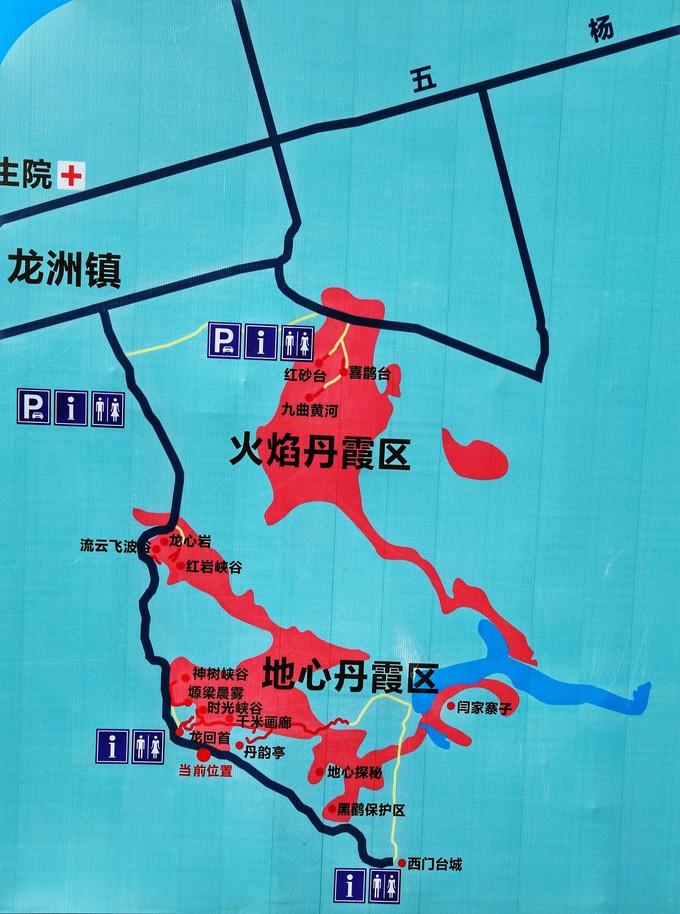 景區(qū)是很大一片區(qū)域,分為水上丹霞區(qū)、火焰丹霞區(qū)、地心丹霞區(qū)三個(gè)部分。路標(biāo)指示不明確,只有“水上丹霞區(qū)”和“火焰丹霞區(qū)”兩個(gè)地方的標(biāo)識(shí),具體需要自行找路。根據(jù)當(dāng)?shù)厝私榻B,整個(gè)景區(qū)有1、2、3、4、5號(hào)五個(gè)景點(diǎn),1至4號(hào)可以自行開(kāi)車(chē)游覽,5號(hào)由于路況不好并且有十多公里路遠(yuǎn),需要花200元左右請(qǐng)當(dāng)?shù)厝藥凡拍芮巴聢D是現(xiàn)場(chǎng)拍的景區(qū)示意圖,能很清晰的看出景區(qū)分布,供大家參考。