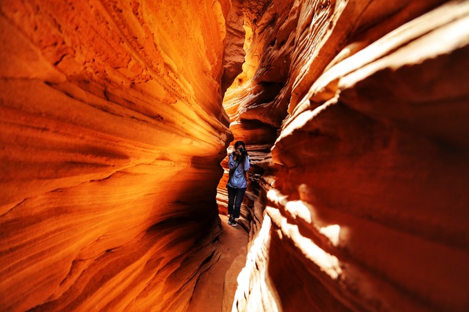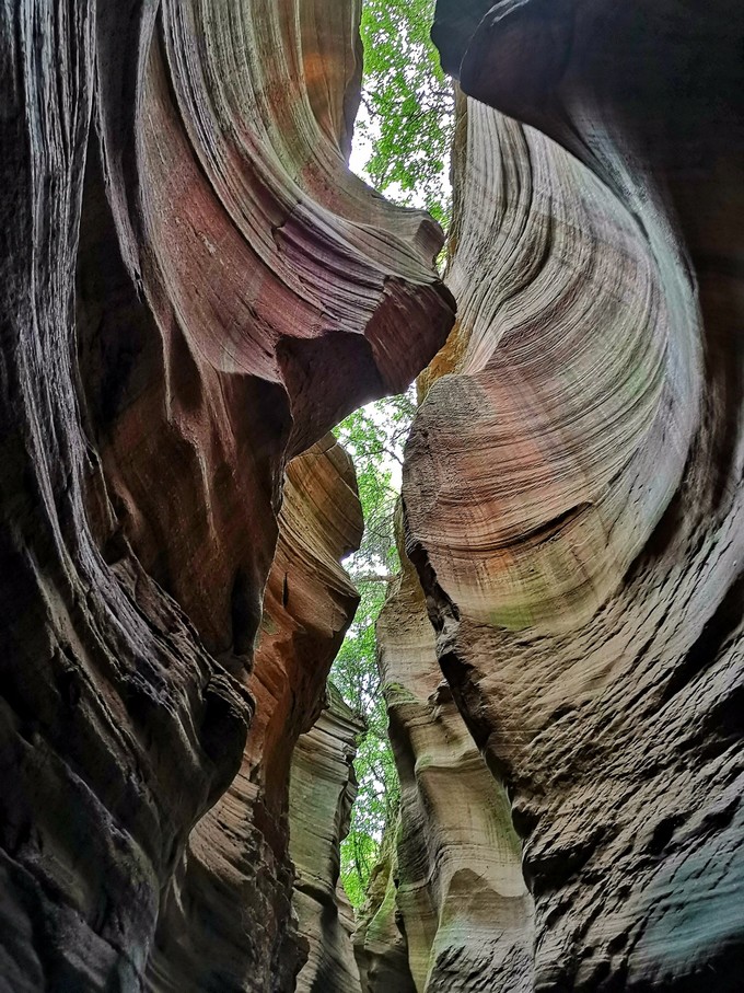 樺樹(shù)溝是景色最美最精華的峽谷,全長(zhǎng)300米左右,溝里游客很多,多到走不動(dòng)路。中午11點(diǎn)至下午2點(diǎn)光線最好,因?yàn)閸{谷頂部狹窄,如果沒(méi)有光線谷內(nèi)比較幽暗。樺樹(shù)溝上窄下寬, 和龍巴溝相反,巖石更有曲線和紋理,色彩也更豐富,配合恰好的光線,絕對(duì)能出大片。