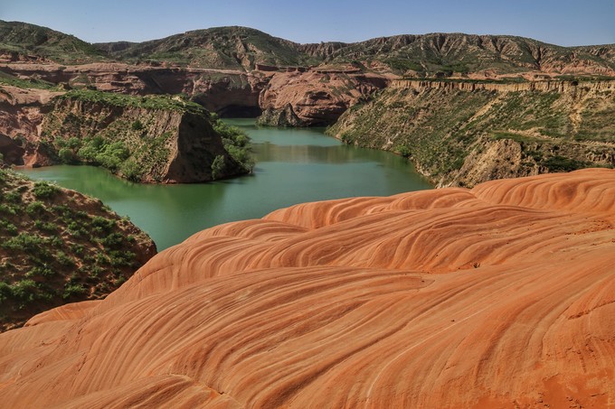 從B停車(chē)場(chǎng)出發(fā),沿小路向前走不多遠(yuǎn),前面就能看到幾個(gè)丹霞紅砂巖山丘,右手邊是土橋和大灣畔兩個(gè)水庫(kù)中間的一個(gè)過(guò)渡的水塘。在半島西北角的山坡下邊有一片水浪波紋的紅砂巖,這里是這個(gè)區(qū)域最驚艷的地方,不僅可以看到碧水藍(lán)天,還能夠眺望對(duì)面大面積的丹霞紅石,最重要的是可以近距離接觸大片波浪紋路的紅砂巖。