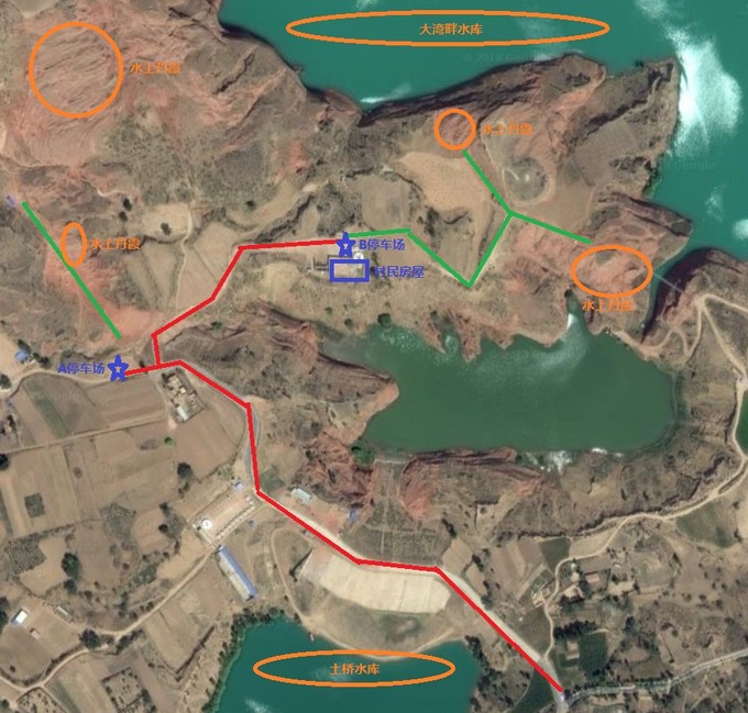 在龍州鎮(zhèn)北邊有幾處明顯的“水上丹霞”指示牌指向水上丹霞,過(guò)土橋水庫(kù)向前幾百米,A停車(chē)場(chǎng)就在路邊,停車(chē)前行就可以看見(jiàn)被圍欄圍起來(lái)的一片丹霞。B停車(chē)場(chǎng)設(shè)在當(dāng)?shù)匾粦艮r(nóng)民的院內(nèi),右手有一個(gè)農(nóng)民自己修建的岔路,進(jìn)去一兩百米就是了。
