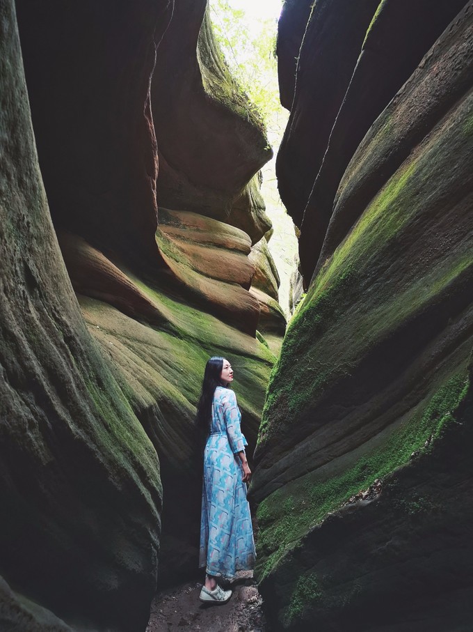 其中,沿著棧道走到最下面左轉(zhuǎn)的閆家寨附近的水面在修碼頭以后會(huì)有游船,右轉(zhuǎn)是所謂的一線天,到入口看了下里面很狹窄,加上雨季可能有落石不太安全就沒(méi)有進(jìn)入。這部分的特點(diǎn)是在峽谷底部的行走,景色沒(méi)有水上丹霞好。