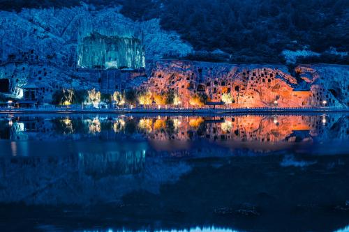 龍門石窟位于河南省洛陽市區(qū)南面12公里處,是一個風(fēng)景秀麗的地方,這里有東、西兩座青山對峙,伊水緩緩北流。遠(yuǎn)遠(yuǎn)望去,猶如一座天然門闕,所以古稱“伊闕”。自古以來,為游龍門的第一景觀。