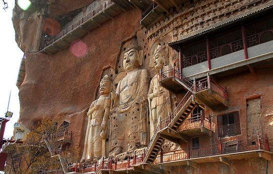 麥積山石窟屬全國重點(diǎn)文物保護(hù)單位,建自公元384年,后來經(jīng)過十多個朝代的不斷開鑿、重修,遂成為我國著名的大型石窟之一,也是聞名世界的藝術(shù)寶庫。麥積山石質(zhì)皆為紫褐色之水成巖,其山勢陡然起獨(dú)峰,最初有許多天然之巖洞。它的海拔1742米,山頂距地面142米,現(xiàn)存洞窟194個,其中有從4世紀(jì)到19世紀(jì)以來的歷代泥塑、石雕7200余件,壁畫1300多平方米。由于麥積山山體為第三紀(jì)沙礫巖,石質(zhì)結(jié)構(gòu)松散,不易精雕細(xì)鏤,故以精美的泥塑著稱于世,絕大部分泥塑彩妝。被雕塑家劉開渠譽(yù)為“東方雕塑陳列館”。它的開鑿年代,大部分學(xué)者認(rèn)為始于后秦,歷經(jīng)北魏、西魏、北周、隋、唐、五代、宋、元、明、清歷代都有不斷地開鑿和修繕,現(xiàn)存造像中以北朝造像原作居多。麥積山石窟的一個顯著特點(diǎn)是洞窟所處位置極其驚險,大都開鑿在懸崖峭壁之上,洞窟之間全靠架設(shè)在崖面上的凌空棧道通達(dá)。游人攀登上這些蜿蜒曲折的凌空棧道,不禁驚心動魄。古人曾稱贊這些工程:“峭壁之間,鐫石成佛,萬龕千窟。碎自人力,疑是神功。”附近群眾中還流傳著“砍完南山柴,修起麥積崖”,“先有萬丈柴,后有麥積崖”的諺語。可見當(dāng)時開鑿洞窟,修建棧道工程之艱巨、宏大。