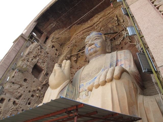 甘谷大佛石窟造象可遠(yuǎn)溯至北魏,具體年代已經(jīng)無從稽考。現(xiàn)存釋迦牟尼大佛像始鑿于北魏,一直到盛唐才趨完美。大佛石胎泥塑,身高23.3米,腰闊10.4米,結(jié)跏跌坐于蓮座之上,高大魁梧,溫順善良,坐于30.2米高、窟頂呈圓拱形的石窟內(nèi),頤面豐滿,肉髻高突,兩耳下垂,頸短并飾三道弦紋,短須作蝌蚪狀,施拔濟(jì)眾生印,足踩豐蓮。窟內(nèi)還殘存懸塑達(dá)摩、頻伽、飛天、卷云、蓮葉等,栩栩如生。