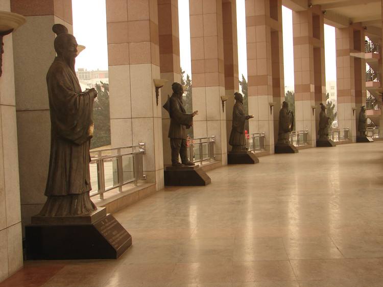 文化長廊位于泉城廣場(chǎng)東側(cè),是泉城廣場(chǎng)東部重要標(biāo)志性建筑物,也是登高欣賞廣場(chǎng)全貌的最佳場(chǎng)所。文化長廊呈圓弧狀,南北長150米,高16米,分三層。墻身嵌以中國傳統(tǒng)柱式造型,體現(xiàn)了傳統(tǒng)文化內(nèi)涵。長廊內(nèi)設(shè)大舜、管仲、孔丘、孫武、墨翟、孟軻、諸葛亮、王羲之、賈思勰、李清照、戚繼光、蒲松齡12尊歷史名人雕塑,鑲嵌在長廊南北兩端及西立面柱基上的14幅浮雕有東方曙光、舜耕歷山、伯禽治魯、太公封齊、管仲霸齊、晏嬰諫君、孔子講學(xué)、子貢貨殖、孫武兵法、稷下爭鳴、孟子游說、魯班學(xué)藝、扁鵲行醫(yī)、鄒衍辯論。這組浮雕命名為《圣賢史跡圖》。