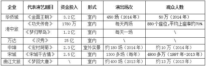 同樣進(jìn)入較早的華僑城集團(tuán),在做深圳錦繡中華項(xiàng)目時便開始打造演藝演出。2012年,華僑城曾計(jì)劃將旗下旅游演藝業(yè)務(wù)單獨(dú)上市,其當(dāng)時做的一份報(bào)告顯示,華僑城目前擁有專業(yè)演職人員2600名,上演原創(chuàng)節(jié)目26臺,累計(jì)推出各類原創(chuàng)節(jié)目57臺,累計(jì)演出63000場次,累計(jì)接待觀眾7600萬人次,已經(jīng)發(fā)展成為全國演出節(jié)目最多、演員數(shù)量最多的旅游集團(tuán)。