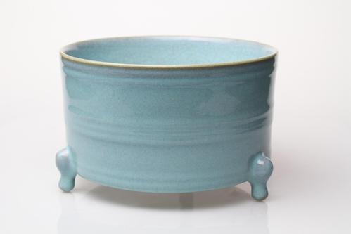此器造型規(guī)整,釉呈淡天青色,柔和溫潤。它應與三足樽配套使用,用以承放三足樽。