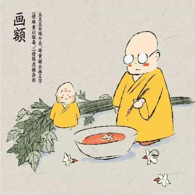 端午節(jié)時以雄黃涂抹小兒額頭的習俗,云可驅避毒蟲。典型的方法是用雄黃酒在小兒額頭畫“王”字,一借雄黃以驅毒,二借猛虎(“王”似虎的額紋,又虎為獸中之王,因以代虎)以鎮(zhèn)邪。除在額頭、鼻耳涂抹外,亦可涂抹他處,用意一致。山西《河曲縣志》云:“端午,飲雄黃酒,用涂小兒額及兩手、足心,……謂可卻病延年。”