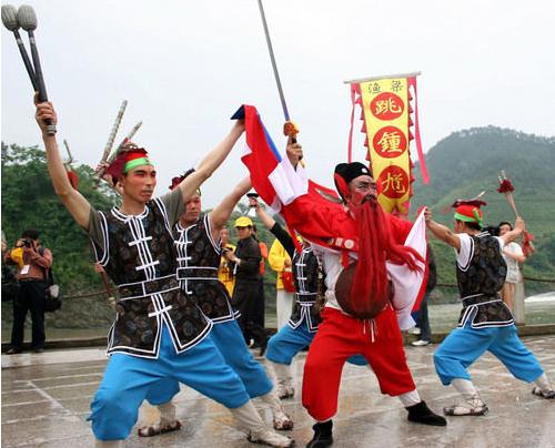 跳鐘馗:一種民間舞蹈,又稱“嬉鐘馗”。據(jù)悉,跳鐘馗,源自北宋,是古徽州遺存下來的一種傳統(tǒng)民俗表演,有《出巡》、《嫁妹》、《除五毒》等多種內容,體現(xiàn)了民眾崇尚鐘馗的剛正不阿和祈盼除害降福的美好愿望。在民間,“鐘馗”是避邪扶正的象征,端午跳鐘馗,寓意為消除五毒,四季平安,人壽年豐。到了清代,江南蘇、浙一帶的居民大都在農歷五月于大門或堂中掛鐘馗圖一月,以期驅邪除害、祛兇引福。