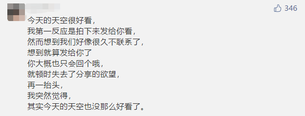 可他看到消息,選擇了視而不見。在你仍舊等待,翹首以盼會收到回復時。他早就把你當作無關(guān)緊要的事,拋到九霄云后。等到突然想起來的時候,就回一個“嗯”。可你卻發(fā)現(xiàn)他的狀態(tài)欄,更換了好幾次。一起聚餐喝酒,別人都帶上愛人,唯獨他不帶你。