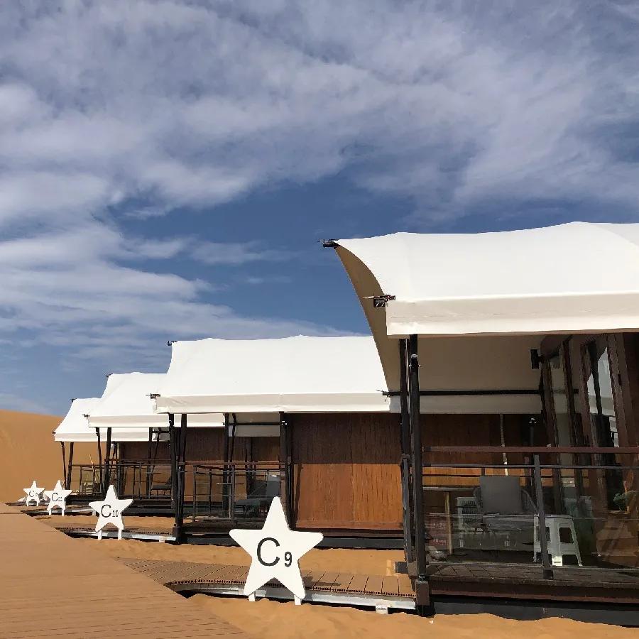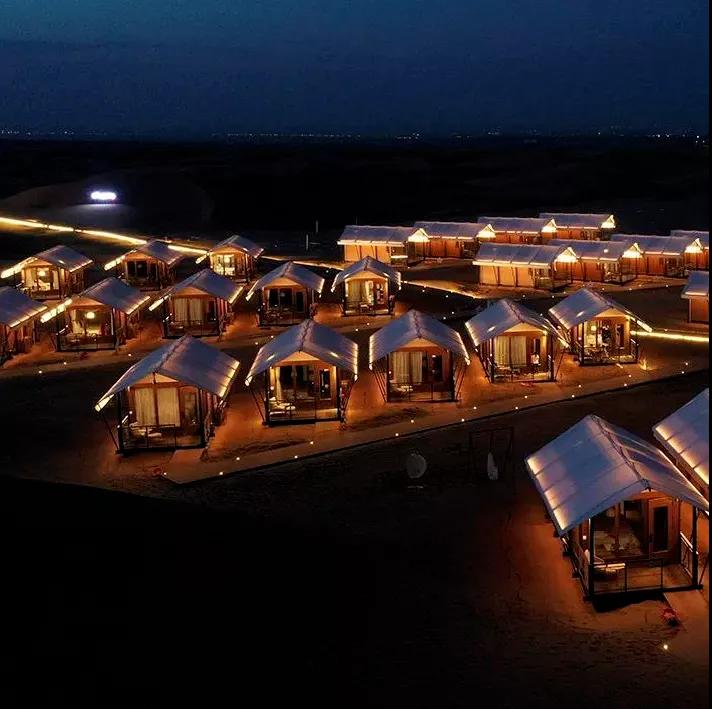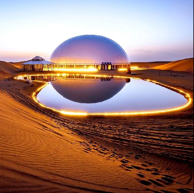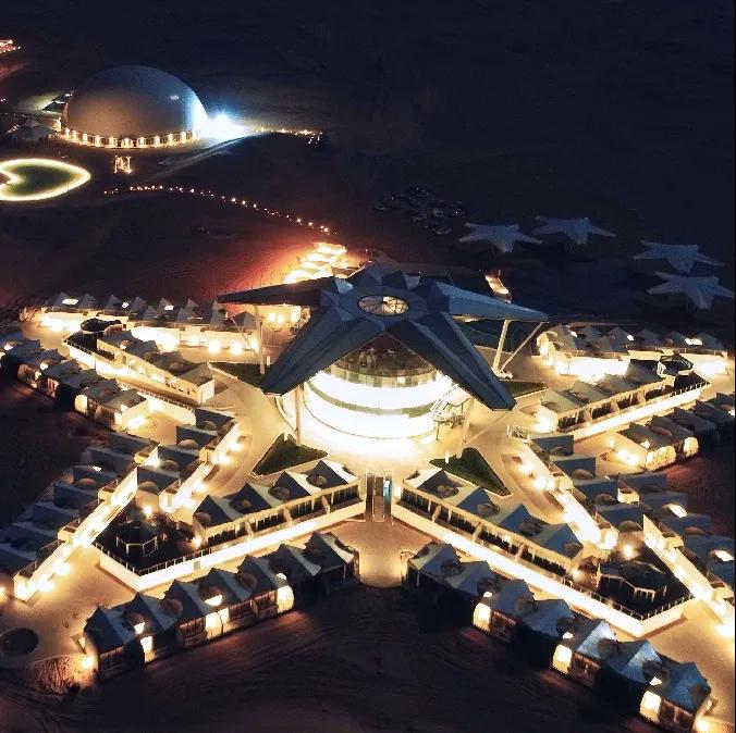 沙漠星星酒店沙漠星星酒店是國(guó)內(nèi)首個(gè)以沙漠觀星為主題的酒店,它坐落在寧夏省中衛(wèi)市沙坡頭旅游度假區(qū)內(nèi),以五角星形狀規(guī)劃設(shè)計(jì),從空中俯瞰正形如一顆顆星星。遠(yuǎn)遠(yuǎn)看到的第一個(gè)建筑則是一個(gè)巨大無(wú)比、白色的半球體,這是酒店的標(biāo)志性建筑——星星劇場(chǎng)的穹頂。及至近前是起伏沙丘上的一棟棟設(shè)計(jì)感十足的精致木屋鱗次櫛比;一面全是玻璃幕墻的觀景房遙遙相對(duì);還有星球穹頂?shù)挠^星房;“半個(gè)太陽(yáng)的驚喜”落日餐廳。餓了,就來(lái)一頓獨(dú)具特色的沙漠晚餐;累了,就住在星星酒店,開(kāi)啟“躺在床上數(shù)星星”的全新旅游方式。
