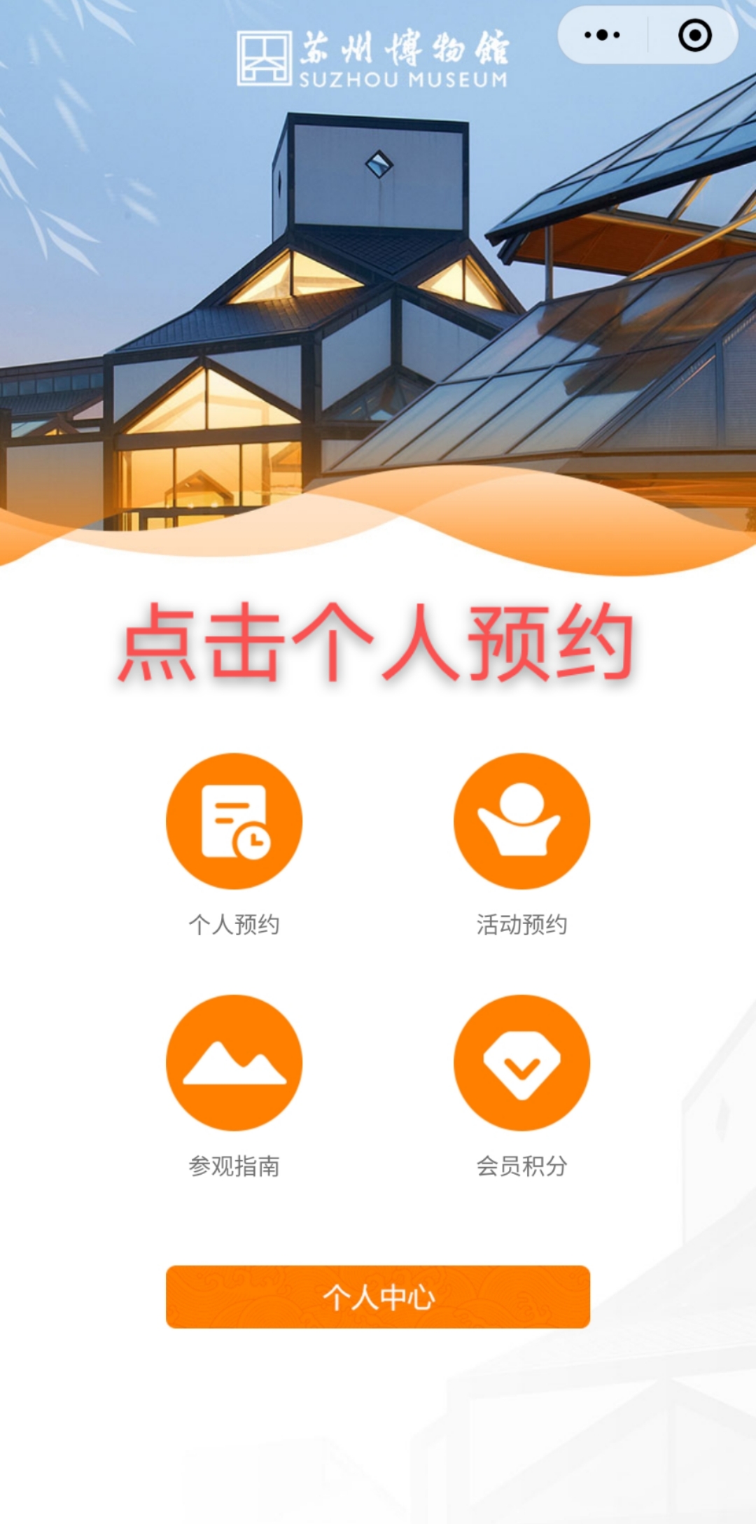 1)預約個人入館通道(6人及以下)個人可提前七天登錄蘇州博物館官方網(wǎng)站、蘇博官方微信公眾號、蘇州博物館全預約小程序、蘇州旅游總入口微信公眾號或文化蘇州云微信公眾號進行參觀預約。如未提前預約日參觀當日仍有余票時,觀眾可在當日進行預約。為充分預留時間進行信息核查,保障觀眾順利入館,蘇州博物館當日預約截止時間設定為停止入館時間前20分鐘(16:00停止入館15:40即停止預約)。