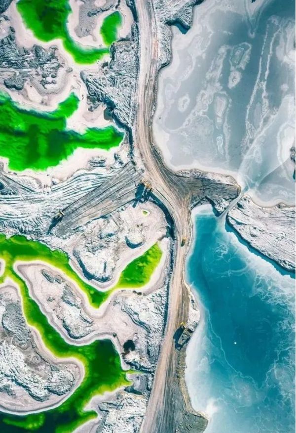 東、西臺(tái)吉乃爾湖,在一條狹長的棕黃色鹽堿土路兩側(cè),呈現(xiàn)出一邊碧綠,一邊青翠,截然相反的絕美水色。