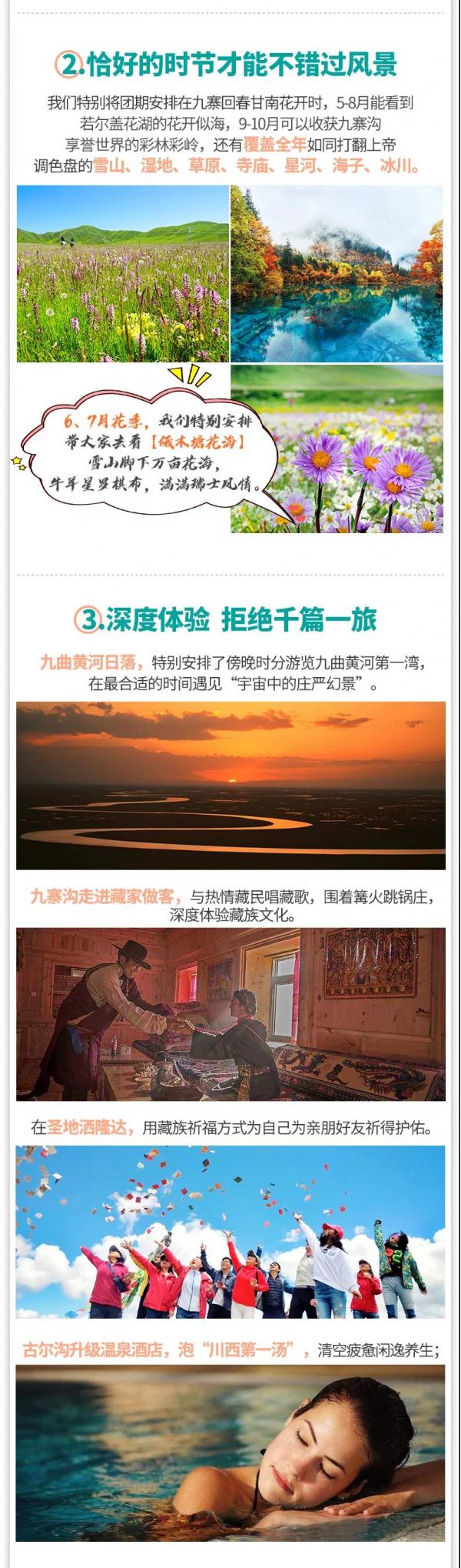 3、九寨溝面積較大游客需求不一,因此主要以游客自助游形式游覽,如無領(lǐng)隊陪同望您諒解。游覽開始前領(lǐng)隊會與您約定好集合時間,請務(wù)必按時到達指定地點,避免耽誤大家接下來的行程;