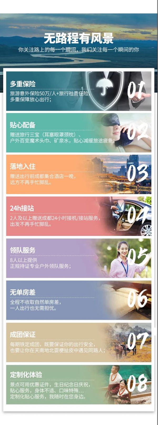 6、領(lǐng)隊服務(wù):8人以上提供正規(guī)持證專業(yè)領(lǐng)隊服務(wù);8人及以下由經(jīng)驗豐富的司機提供向?qū)Х?wù)。