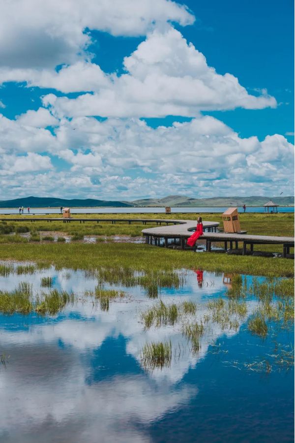 然后我們前往草原湖泊【若爾蓋花湖】,花湖湖面遼闊,水下是深不可測的沼澤地,在陽光的照耀下,水面反射出不同的光彩,攝人心魄。湖邊是大片茂密的蘆葦叢,隨微風(fēng)拂動,越發(fā)映襯出湖面的寧靜與滄桑。花湖最漂亮的時候是每年夏天,草地上開滿了五顏六色的花朵,極為漂亮。廣闊的草原一片碧綠,藍色的花湖被一片綠色包圍,仿佛綠色地毯上的一顆藍寶石,美輪美奐。湖邊建有木質(zhì)棧道,一直延伸到水中,可以沿著棧道走到濕地深處,沿途都可以找到拍大片的好角度。花湖是眾多野生飛禽的主要棲息地,湖面上游弋著黃鴨、斑頭雁、天鵝、黑頸鶴等珍稀動物,還有高原魚類和其他珍稀動物。坐在湖邊或者棧道上的亭子里,常有黑頸鶴從湖面上掠過。