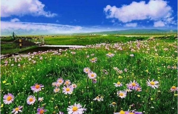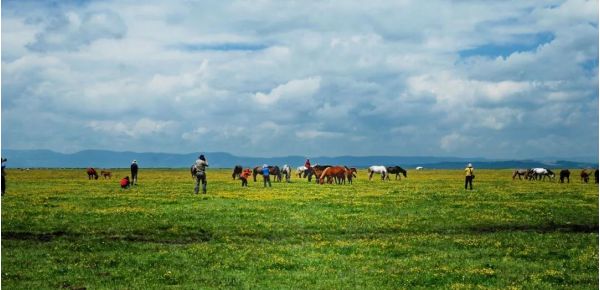 夏天的桑科草原綠草如茵,牛羊遍野,各種野花爭奇斗艷,幾十座白色的帳篷點(diǎn)綴在綠草地上,眼前的一切似乎夢(mèng)里才會(huì)見到,美的極不真實(shí)。