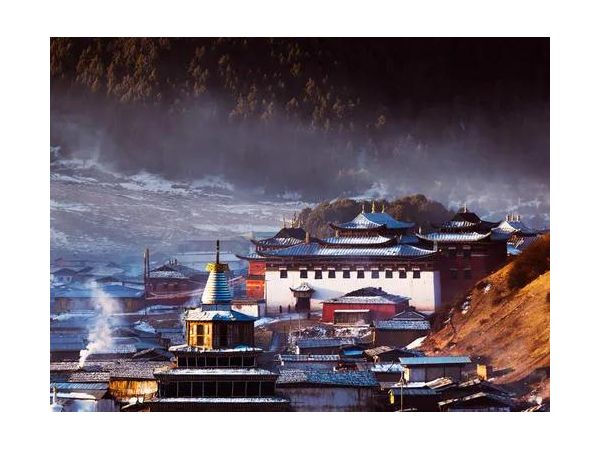朗木寺最美的是清晨,小鎮(zhèn)被薄霧和炊煙籠罩,遠(yuǎn)處朝陽的光彩映在郎木寺的紅色礫巖上,佛塔、清真寺和民房的屋頂都呈現(xiàn)出溫暖的光澤,整個(gè)小鎮(zhèn)就洋溢著一種淡淡的卻又揮之不去的恬靜與親和。