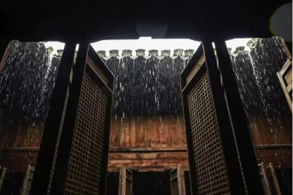 徽州的民居建筑,在高大的馬頭墻內(nèi),天井是古民居的一個(gè)特色,上可見(jiàn)天,下可排水,采光通風(fēng),江南多雨時(shí)雨水沿水梘流向屋內(nèi)下道(明堂),俗稱四水歸堂,寓意為聚斂財(cái)氣。