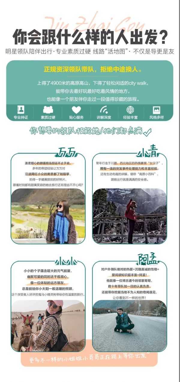 私人訂制:我們業(yè)我們客戶(hù)范圍囊括了全國(guó)各大城市,川西、西北、東北,皖南,貴州,在路上永遠(yuǎn)有我們的身影。我們將為每一個(gè)有定制需求的你策劃出獨(dú)屬于自己的完美旅行。