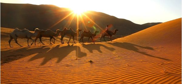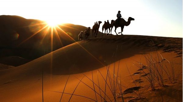 2、探尋中國(guó)最美的「巴丹吉林大沙漠」,拍攝駝隊(duì)在落日的沙漠中旖旎而行,日出日落時(shí)美麗的沙漠光影線條;