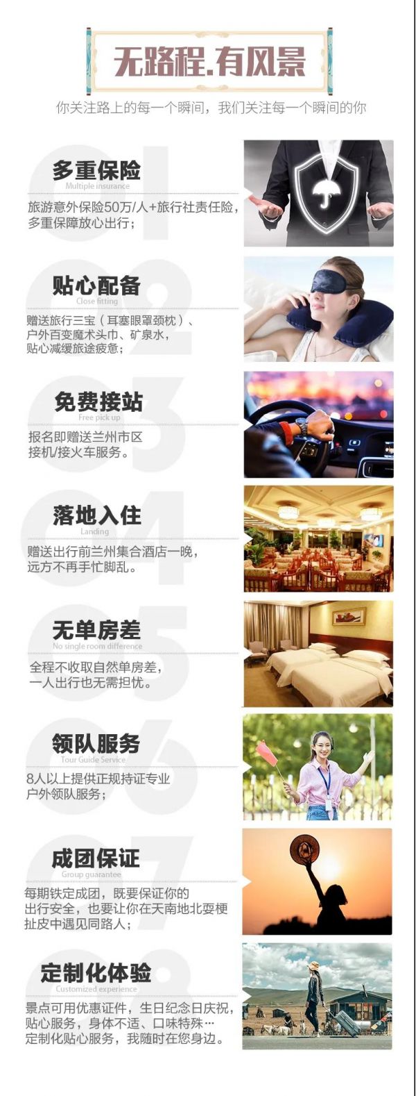服務(wù):8人以上提供正規(guī)持證專業(yè)戶外領(lǐng)隊(duì)服務(wù);8人及以下由經(jīng)驗(yàn)豐富的司機(jī)提供向?qū)Х?wù)。保險(xiǎn)贈(zèng)送旅游意外保險(xiǎn),旅游意外保險(xiǎn)最高賠付50萬(wàn)元/人(外賓另議),購(gòu)買旅行社責(zé)任險(xiǎn);保險(xiǎn)不含財(cái)產(chǎn)險(xiǎn),請(qǐng)游客保管好自己的財(cái)物;因旅行意外造成的客人意外傷害,按保險(xiǎn)公司規(guī)定賠償,我方不承擔(dān)另外的賠償責(zé)任;如游客有需要可自行購(gòu)買其他保障險(xiǎn)。