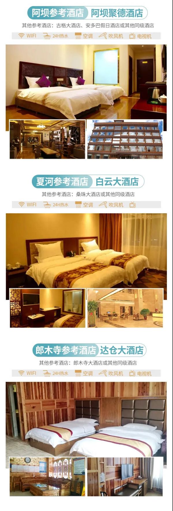 l 阿壩:阿壩縣聚德酒店、古格大酒店、安多巴假日酒店或其他同級(jí)酒店