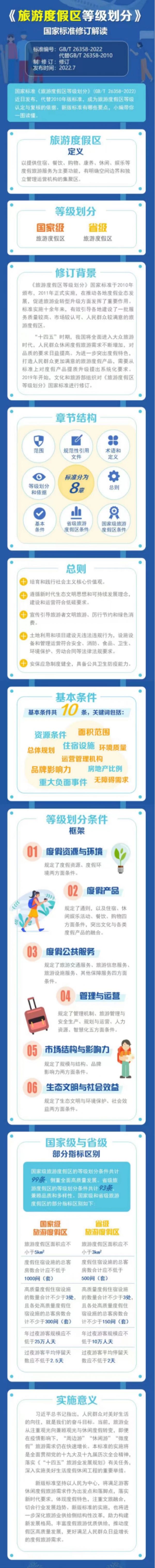 近日,文化和旅游部完成修訂《旅游度假區(qū)等級劃分》國家標(biāo)準(zhǔn)(GB/T 26358-2022)。新版標(biāo)準(zhǔn)于7月11日發(fā)布,自2023年2月1日起實(shí)施。