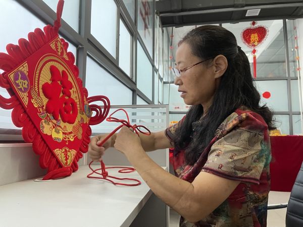 李建霞出生在茌平區(qū)馮官屯鎮(zhèn)大呂村,從小跟著外婆生活,外婆是她學(xué)習(xí)繩結(jié)手藝的啟蒙老師。李建霞的外婆年輕時在一個大戶人家做幫工,日常工作包括紡線、染布等,有時也制作中國結(jié)等一些小飾品。“五六歲時,我就跟著外婆紡線,十多歲時就自己縫衣服,后來全家的針線活都是我自己做。”李建霞回憶。在干家務(wù)活的過程中,李建霞練就了一雙巧手。1988年,在聊城農(nóng)校上學(xué)時,李建霞進(jìn)一步接觸到一些關(guān)于編織的知識。成家后,為了照顧孩子,李建霞辭掉了工作。一次偶然的機(jī)會,她在電視上看到一個制作中國結(jié)的視頻,便萌生了手工制作中國結(jié)的想法。2003年,李建霞先后到青島、濟(jì)南等地學(xué)習(xí)中國結(jié)制作技藝,開始在網(wǎng)上接訂單,后來創(chuàng)辦了大姐工坊——茌平區(qū)金鑫中國結(jié)藝制品有限公司。