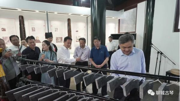 領(lǐng)導(dǎo)嘉賓對編鐘編磬“一見鐘情”,紛紛上前,敲響這自2400多年前就響徹華夏的中國聲音!大家在周達(dá)老師的引導(dǎo)下,參觀了雅樂琴文化展廳、衣冠華夏廳、古琴非遺傳習(xí)所、書畫創(chuàng)作展示以及斫琴體驗廳等區(qū)域。并且駐足鑒賞園區(qū)內(nèi)每一副牌匾及楹聯(lián),給予高度贊賞! 聊城古琴藝術(shù)館,打造集琴文化展示、斫琴體驗、非遺傳習(xí)、古籍研究、書畫創(chuàng)作于一體的文化新空間,既為廣大古琴愛好者提供一個學(xué)習(xí)展示交流的專業(yè)平臺,又能為市民群眾和外地游客帶來更加直觀的視聽體驗。