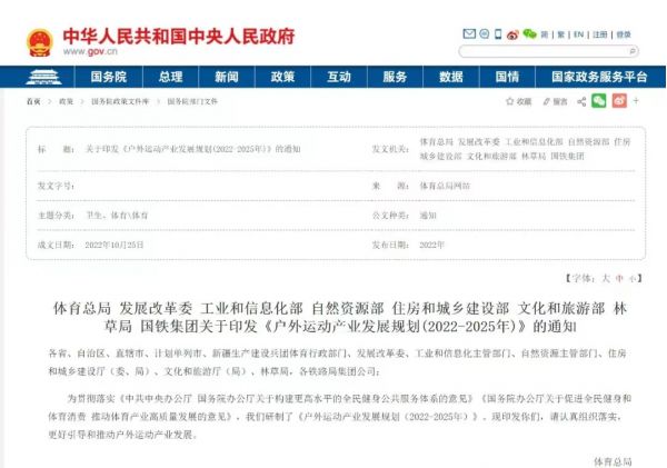 體育總局 發(fā)展改革委 工業(yè)和信息化部 自然資源部 住房和城鄉(xiāng)建設(shè)部 文化和旅游部 林草局 國(guó)鐵集團(tuán) 關(guān)于印發(fā)《戶(hù)外運(yùn)動(dòng)產(chǎn)業(yè)發(fā)展規(guī)劃(2022-2025年)》的通知
