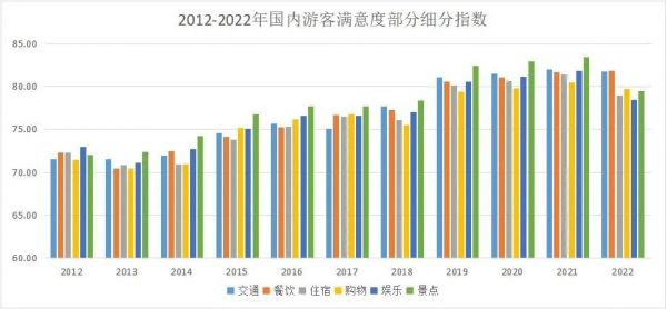 滿意度調(diào)查數(shù)據(jù)顯示,2012-2021年,城市交通、餐飲、住宿、購(gòu)物、娛樂(lè)、景點(diǎn)細(xì)分滿意度指數(shù)不斷提升。2012-2015年各細(xì)分指標(biāo)處于“一般滿意”區(qū)間,2015-2018年各細(xì)分指標(biāo)升至“基本滿意”區(qū)間,2019年起各細(xì)分指標(biāo)向“滿意”區(qū)間靠近,2021年各細(xì)分指標(biāo)均達(dá)到滿意水平。2022年以來(lái),游客對(duì)交通、餐飲等方面的滿意首次超過(guò)景區(qū)景點(diǎn)。