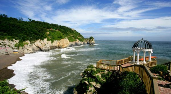 三面環(huán)山,一面瀕海;北面為群山環(huán)繞,蒼松翠柏,島上岸崖陡峭,怪石嶙峋,山花野草遍及全島,南面是開闊的海域和平坦的沙灘。長達(dá)2.3公里的海濱設(shè)有海水浴場,有細(xì)沙區(qū),也有卵石區(qū),非常適合散步和看海。