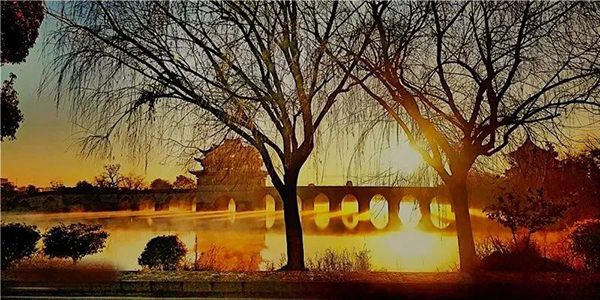 清晨,太陽沖破地平線,陽光從建水縣雙龍橋的橋孔下穿射而出,宛如油畫般的場景,就這樣展現(xiàn)在眼前