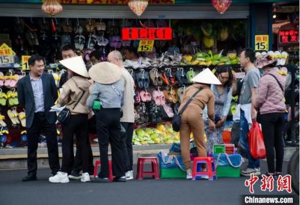 單肩挎包幾乎是范氏香和同行們的標(biāo)配,女子戴著一頂圓錐形的帽子,男人們則戴一頂圓頂帽子,他們穿梭在人群中售賣越南小商品,構(gòu)成中越邊境上的一道獨(dú)特風(fēng)景線。