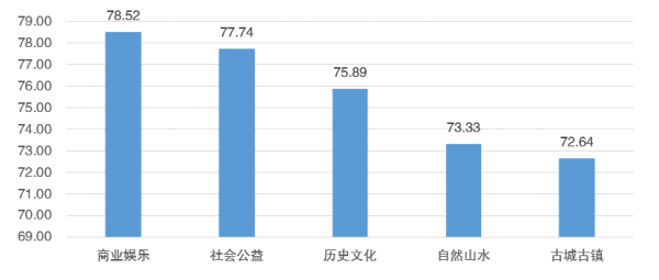 全國(guó)318家5A級(jí)景區(qū)按照類(lèi)型可以劃分為歷史文化、商業(yè)娛樂(lè)、社會(huì)公益、自然山水以及古城古鎮(zhèn)五大類(lèi)。不同類(lèi)型的景區(qū)影響力也不同,從統(tǒng)計(jì)數(shù)據(jù)來(lái)看,商業(yè)娛樂(lè)型景區(qū)綜合影響力位列第一,為78.52;其次為社會(huì)公益型景區(qū),滿意度為77.74;歷史文化型景區(qū)位居第三,滿意度為75.89。可見(jiàn)游客對(duì)于商業(yè)娛樂(lè)型、社會(huì)公益型、歷史文化型的景區(qū)的熱情都比較高漲。