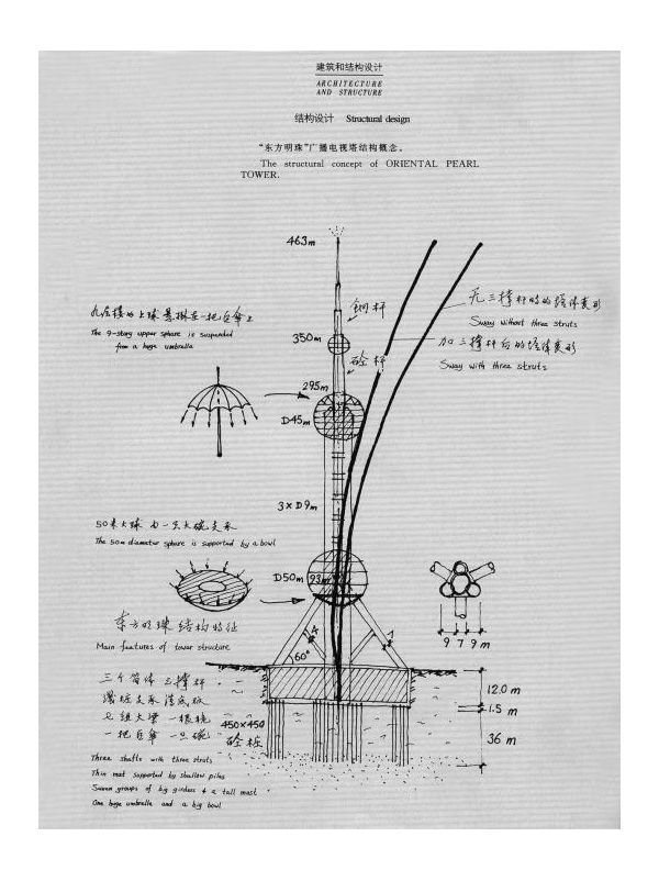東方明珠廣播電視塔主體為多筒結(jié)構(gòu),由3根斜撐、3根立柱及廣場、塔座、下球體、5個小球體、上球體、太空艙、發(fā)射天線桅桿等構(gòu)成,主體結(jié)構(gòu)高350米,總高468米,總建筑面積達(dá)10萬平方米。