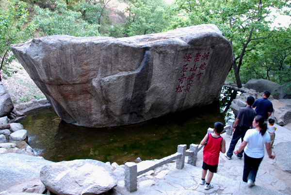 元寶石,上鐫“此地有崇山峻嶺,怪石奇松。古檀寧椿,“古檀”是密云。寧椿是名字。古密云縣的一位舉人經(jīng)過(guò)這里,被盤山的美景吸引住了,他想用一句話來(lái)概括盤山的勝景,于是他便借用了晉代著名書法家王羲之的《蘭亭序》中有“此地有崇山峻嶺,茂林修竹”一句,他看到盤山松樹長(zhǎng)勢(shì)奇特,巖石形狀怪異。因而在這里留下了“此地有