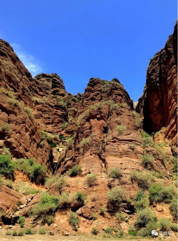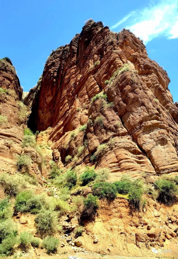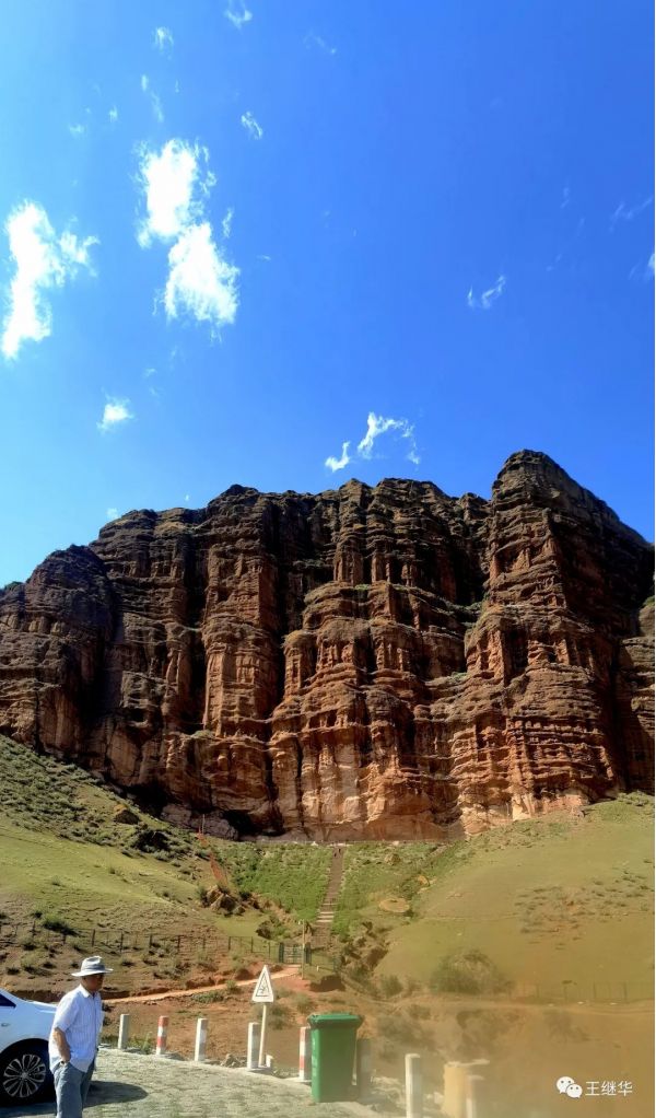 這個景區(qū)叫赤壁西湖,山峰是紅色,它的紋理比較特別,山水畫里邊兒28種存法,也表現(xiàn)不完全的風(fēng)貌。,縱橫交錯,成成疊疊,點(diǎn)點(diǎn)滴滴,宏偉總不乏婉約,剛硬中不乏圓潤。在藍(lán)天白云的映襯下,別有一番風(fēng)味兒。