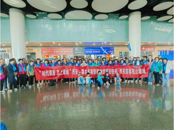 從陜西省西安市起飛的東航MU2323次航班載著100余名游客抵達(dá)鄂爾多斯市 開啟鄂爾多斯之旅