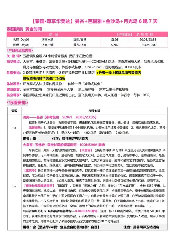 泰國(guó)7天6夜游 聊城出發(fā) 純玩 無(wú)購(gòu)物 曼谷 芭堤雅 珊瑚島 金沙島 ...... 出團(tuán)日期 20230610 價(jià)格 3180 報(bào)名電話 0635 8681234