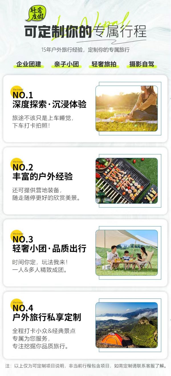 私人訂制:我們業(yè)務(wù)范圍囊括了全國各大城市,川西、西北、西藏、新疆,在路上永遠(yuǎn)有我們的身影。我們將為每一個有定制需求的你策劃出獨屬于自己的完美旅行。