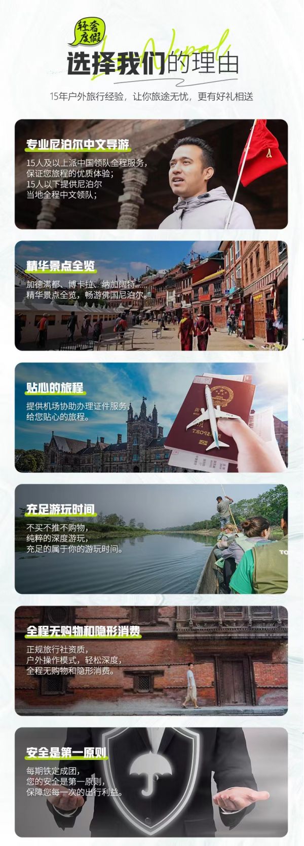 4.導(dǎo)游服務(wù):15人及以上派中國領(lǐng)隊全程服務(wù),保證您旅程的優(yōu)質(zhì)體驗;15人以下提供尼泊爾當(dāng)?shù)厝讨形念I(lǐng)隊(成都機場有送機人員協(xié)助辦理登機牌、出發(fā)手續(xù))。