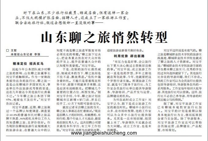 劉寶平透露,近期,聊之旅做過一個品牌認知度調(diào)查,調(diào)查顯示60.8%的普通市民對聊之旅品牌不熟悉,86%的機關單位工作人員知悉聊之旅,且評價很好。作為現(xiàn)階段聊城旅游行業(yè)規(guī)模最大的旅游企業(yè),在普通大眾中的認知度不高是聊之旅進軍散客市場必須攻克的難題。“聊之旅下定決心,把業(yè)務重點放在對大眾市場的開發(fā)上,提升在普通大眾中的認知度和美譽度。”劉寶平說。