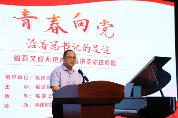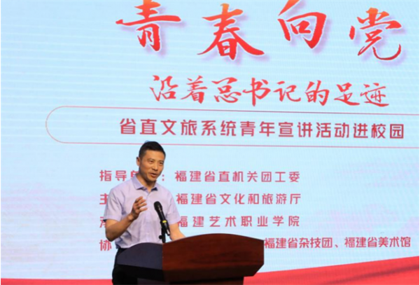 為更好在主題教育中推動(dòng)省直文旅系統(tǒng)青年深入學(xué)習(xí)貫徹習(xí)近平新時(shí)代中國(guó)特色社會(huì)主義思想,用正青春的故事讓青年感受到甘甜“黨味”。6月3日上午,在福建省直機(jī)關(guān)團(tuán)工委的指導(dǎo)下,由福建省文化和旅游廳主辦,福建藝術(shù)職業(yè)學(xué)院承辦,福建省圖書館、福建省雜技團(tuán)、福建省美術(shù)館協(xié)辦的“青春向黨·沿著總書記的足跡”省直文旅系統(tǒng)青年宣講進(jìn)校園活動(dòng)在福建藝術(shù)職業(yè)學(xué)院開講。