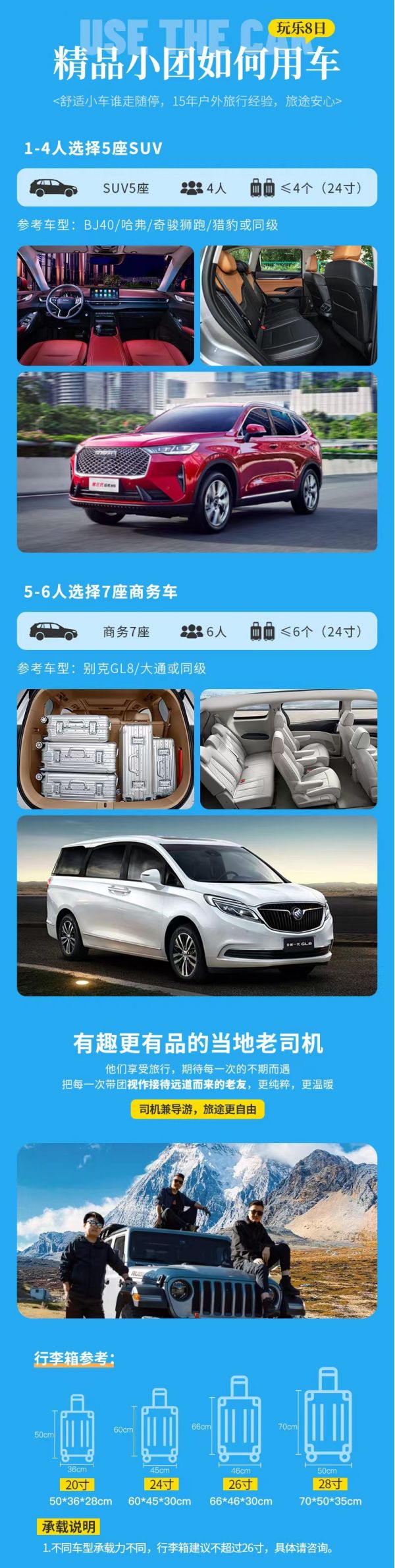 交通:2-6人VIP私享小團(tuán)全程舒適SUV/商務(wù)車出行;車型大小根據(jù)實際人數(shù)安排,且由駕駛經(jīng)驗豐富的司機(jī)為您的出行保駕護(hù)航,報價包含車費、油費、停車費、維修費及司機(jī)勞務(wù)費。