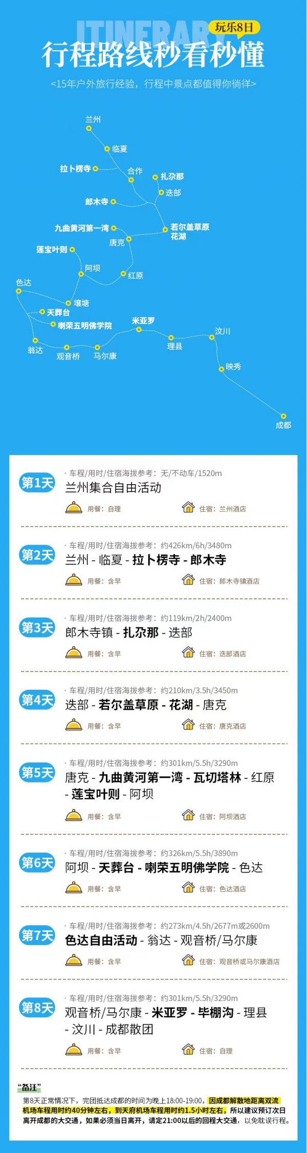 請對應(yīng)使用我方色達(dá)甘南2-6人小團(tuán)8日行程,因使用其它行程造成的投訴,責(zé)任自負(fù);請仔細(xì)閱讀以上行程文檔,同意并保證遵守我方安排,以免為您帶來不必要的麻煩;如產(chǎn)生合同糾紛或人身意外事故,按《中華人民共和國合同法》、《道路交通法》、《保險賠償條例》裁定;本行程作為旅游合同附頁與旅游合同同等法律效力。