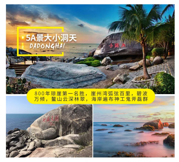 【大小洞天】(游覽時間不少于120分鐘)5A級景區(qū)洞天福地,壽比南山不老松的山海奇觀,這里海天一色,海風習習,椰林婆娑,如詩如畫,“碧海連天遠,瓊崖盡是春”嘆為觀止的800年崖州第一景觀;