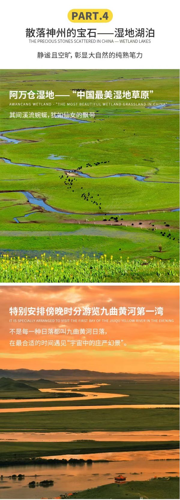 繼續(xù)行程,我們將來到“中國最美濕地草原”——【阿萬倉濕地】,這片濕地臥在甘肅省南部黃河的臂彎里,黃河自西向東從青海久治進入瑪曲木西合,因水瀉不暢而形成很多汊河和沼澤,使這片廣袤的草原水草豐茂、牛羊肥壯。這里地處偏遠,但也正因他的閉塞,才造就了這片世界遺落的草原的幽美浩瀚,彎曲的河流,登上觀景臺,俯瞰一望無垠的阿萬倉濕地,散落的牦牛、潔白的羊群在茵茵草場上星羅棋布,沼澤在陽光下泛著粼粼光波,如同一幀靜止的電影畫面,閑逸至極。從阿萬倉濕地驅(qū)往阿壩的途中我們會途經(jīng)桑科草原,解鎖車觀桑科草原的新視角、新體驗。