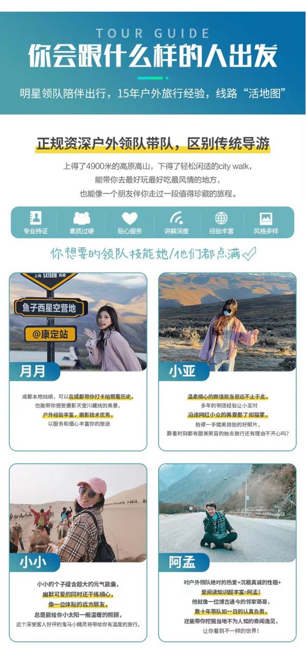 私人訂制:我們業(yè)務范圍囊括了全國各大城市,川西、西北、西藏、新疆,在路上永遠有我們的身影。我們將為每一個有定制需求的你策劃出獨屬于自己的完美旅行。